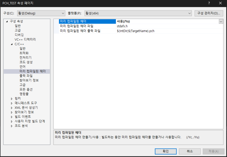 그 후 미리 컴파일된 헤더를 사용(/Yu)을 선택하고 적용한다.