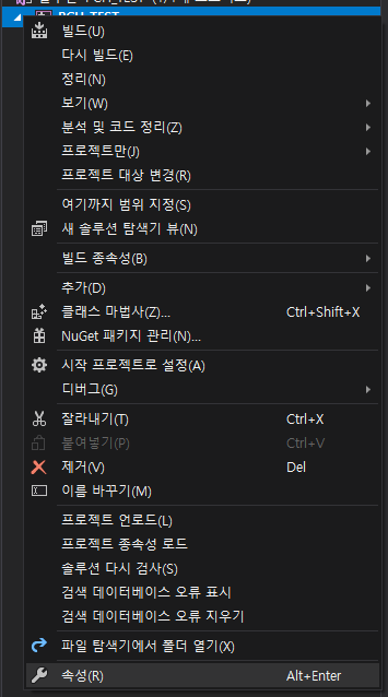 Precompiled Header 설정을 위해 프로젝트 속성을 누른다.